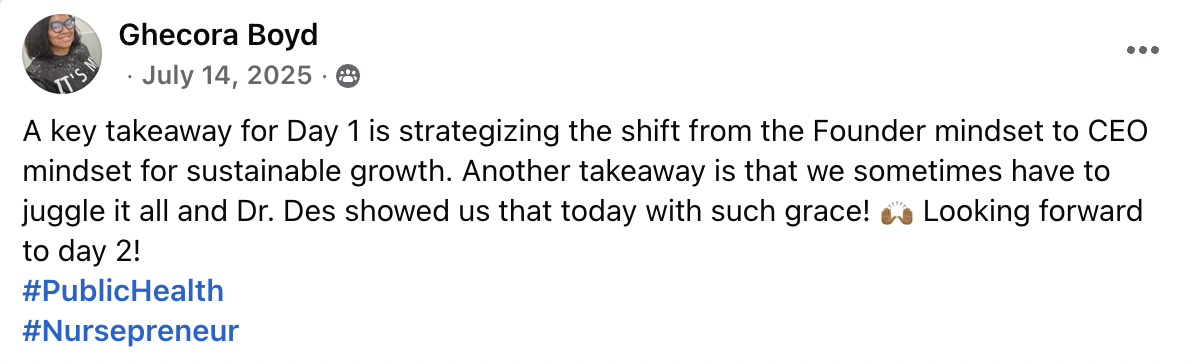 I created the CEO Bootcamp because I kept seeing brilliant public health professionals building meaningful businesses—while carrying far too much on their own.